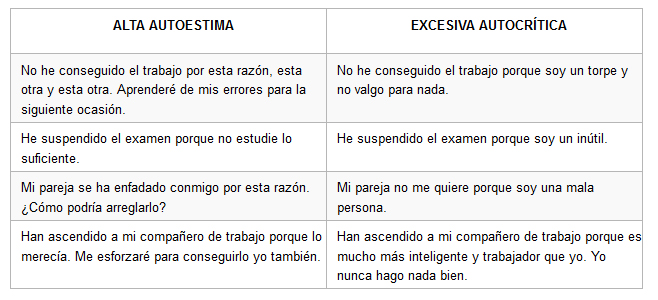 Vamos a poner unos ejemplos que comparen pensamientos de una persona con autocrítica excesiva con los pensamientos de una persona con alta autoestima: